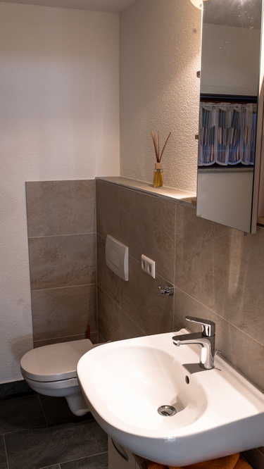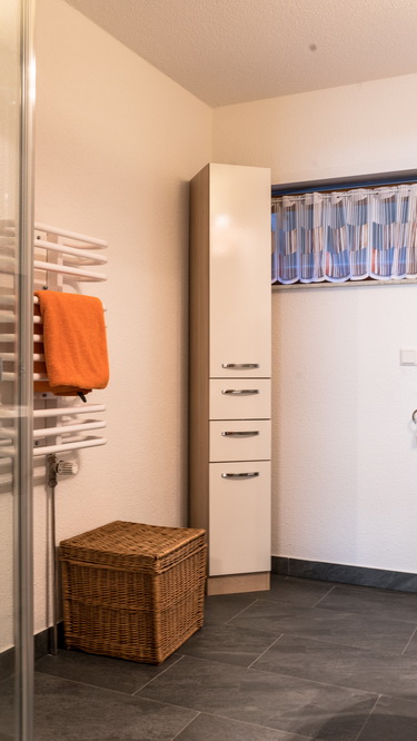 Das Badezimmer ist mit Handtüchern und Bademantel ausgestattet.